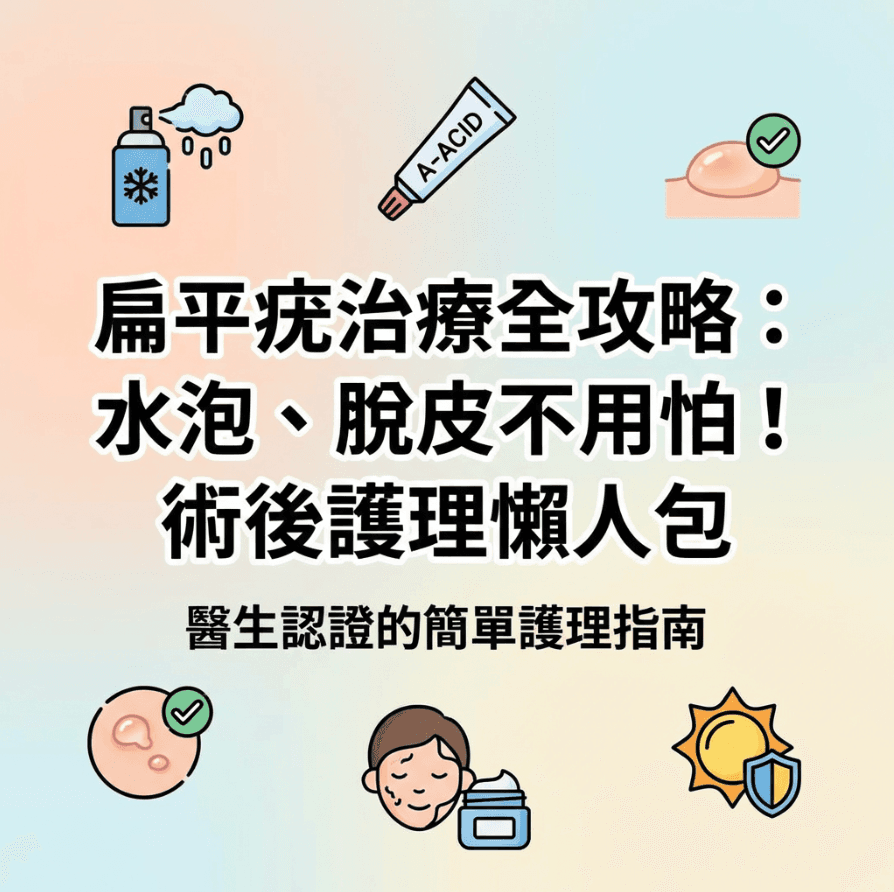 治療扁平疣是一場耐力賽,治療後的皮膚反應往往讓患者焦慮不已。本指南針對三大主流療法提供詳細護理建議:1. 冷凍治療:解釋水泡形成原因,強調小水泡自行吸收、大水泡需回診引流,嚴禁自行刺破。2. 外用 A 酸:說明「預期性脫皮」與紅腫是藥物發揮作用的跡象,並提供「做一休一」與加強保濕的緩解策略。3. 雷射治療:強調結痂期(5-7天)絕對不可摳除痂皮及嚴格防曬的重要性。文章最後統整了「勿抓、重保濕、防曬」三大黃金法則,確保治療效果最大化並降低疤痕風險。