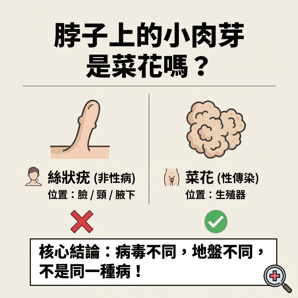 脖子、眼皮或腋下長出的細長小肉芽,究竟是「絲狀疣」還是「菜花」?許多人因外觀相似而陷入恐慌。本文綜合全球醫學資料庫,明確指出絲狀疣屬於非性病皮膚感染,與私生活無關。內文詳細對比兩者的 HPV 病毒型別、外觀特徵、傳染途徑,並提供正確的皮膚科治療建議,助您打破迷思,擺脫不必要的焦慮。