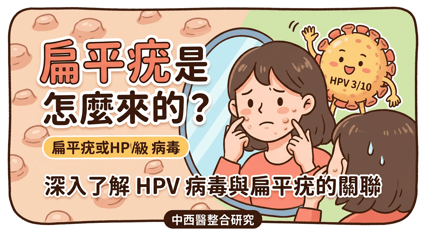 臉上或手背突然長出一粒粒微小突起物?當心是感染了低風險型 HPV 病毒所引起的「扁平疣」!本文深入探討扁平疣的成因與傳染途徑,釐清它與子宮頸癌的真實關聯,並解析為何「熬夜、壓力大、愛抓癢」會導致病灶大爆發。同時為您公開最完整的中西醫整合治療方案(雷射、冷凍、中藥體質調理、火針),教您如何由內而外斷絕復發根源!